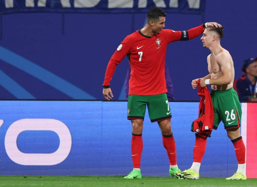Leipzig (Germany), 18/06/2024.- Portugal player Francisco Conceicao (R) celebrates with teammate Cristiano Ronaldo after scoring his team’s second goal during the UEFA EURO 2024 group F soccer match between Portugal and the Czech Republic, in Leipzig, Germany, 18 June 2024. (República Checa, Alemania) EFE/EPA/MIGUEL A. LOPES