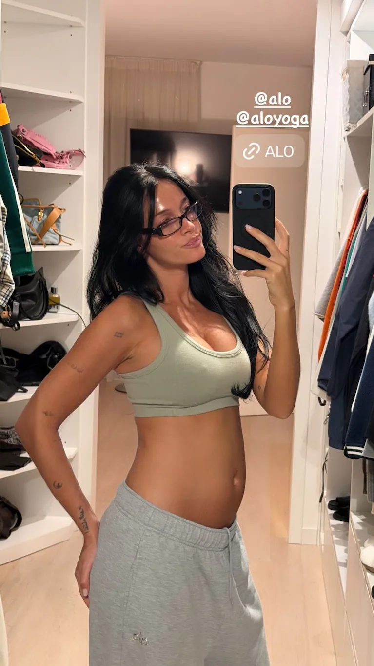 En la imagen, Oriana aparece sonriente con un look deportivo compuesto por un top verde claro y un jogging gris a la cadera, dejando ver los cambios de su figura durante el primer semestre del embarazo.